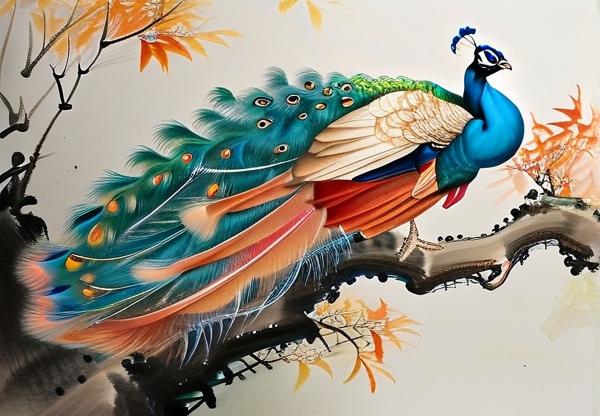 画作背景以南宋院体画的青绿山水为基调,山石肌理中暗藏玄机:画家用矿物颜料铺设色阶时,刻意保留部分生宣的"露白"技法,形成古典美学与现代留白哲学的奇妙共生。这种对传统的解构创新,在庆祝10月传统文化月的语境下显得尤为应景。当观者聚焦孔雀眼翎的"破格"设计——左侧传统蝙蝠纹样与右侧抽象几何图形形成对位——不难看出艺术家对文化基因解码重组的雄心。